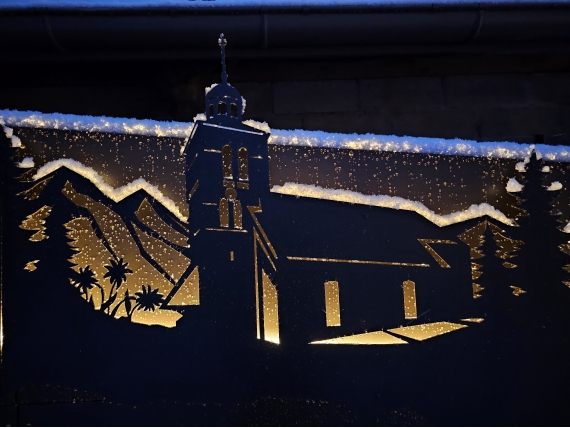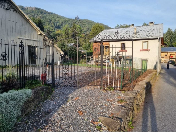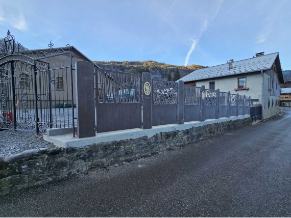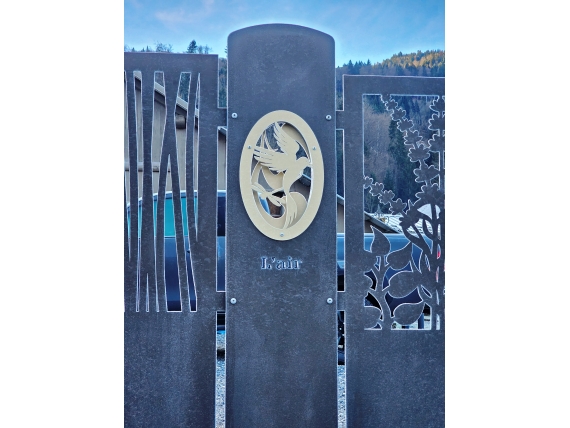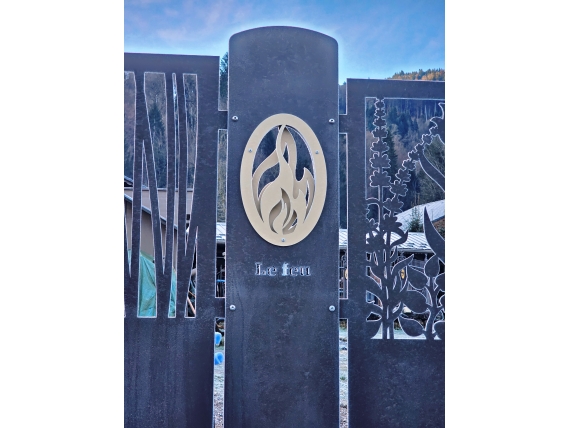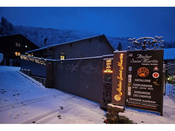 Autour de l’Atelier Saint Martin, un magnifique portail coulissant de plus de 4 m attire le regard. Il est impressionnant de constater les transformations après les travaux. L' ossature du portail est en tube acier avec des panneaux en tôle aluminium. Frédéric Andrès a demandé personnellement à Isabelle de « IC-DESIGN » de transposer ses idées sur le thème de la vie en montagne. Il s’agissait pour elle de créer, de dessiner le lien fort qui unit Frédéric aux sommets alentours comme le Criou, aux paysans, aux vieux chalets, à la faune et à la flore environnante, à l’église de Morillon, le tout en harmonie. Réussie, cette fresque se déroule sur des panneaux en tôle aluminium d’une épaisseur de 4 m/m avec fixation par visseries en inox. L’entreprise partenaire Gunther a pu découper au laser les motifs conçus en amont par Isabelle. La partie du portail à côté de l’atelier est dotée d’un système permettant de coulisser grâce à l’automatisme CAME.