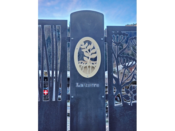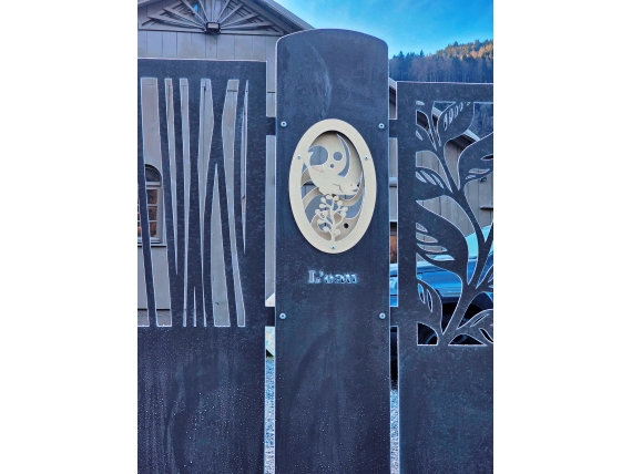Côté route, la clotûre se déroule dans l’esprit des 4 Eléments, Terre, Eau, Air, Feu, avec des panneaux décoratifs en alu épaisseur 4 m/m avec des fleurs, arbres etc. Les poteaux sont en tôle d’une épaisseur de 20 m/m et les platines de fixations sont en acier avec des goujons d’ancrages en inox.
