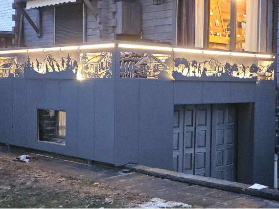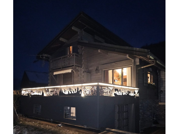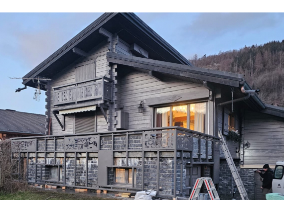 Le bas du chalet et l'entourage du garage sont transformés. Nous avons posé une structure métallique tubulaire et fer plat, avec éléments démontables ; assemblages par visseries inox.