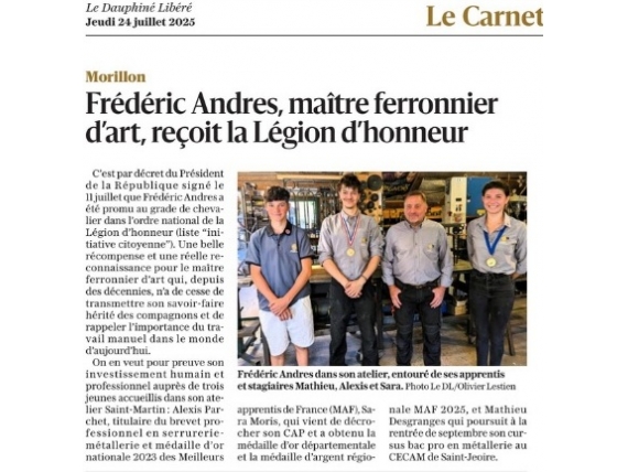 La promotion de la Légion d’honneur du 14 juillet 2025, publiée dimanche 13 juillet au Journal officiel, a distingué dix chefs d’entreprise de la région Auvergne-Rhône-Alpes aux profils variés dont le mien. J'ai été touché de faire partie de cette liste, mon nom étant bien sûr indissociable de l'Atelier Saint Martin où tant d’œuvres et d'ouvrages ont été créés avec mes jeunes apprentis. Cette distinction me touche et m'honore bien sûr et je remercie toutes celles et ceux qui ont soutenu mon travail et encouragé à l'obtention de cette distinction.